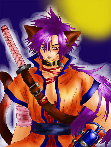 うに様に塗っていただいた、牙参です!いや…ほんとに、元は私の線画なのか…!?というくらいに、かっこよく塗られていて、感動ですv服のしわの描き方や髪の塗り方まで、質感がとても出ていますね。ちょっと薄汚れた感じの服の色が良い味出してます。背景は、雷…そして、雨が降ってるのですね。雨に塗れている牙参…一体何を思ってそこに立っているのでしょうか…。。素敵な塗り絵、有難うございました!! |
