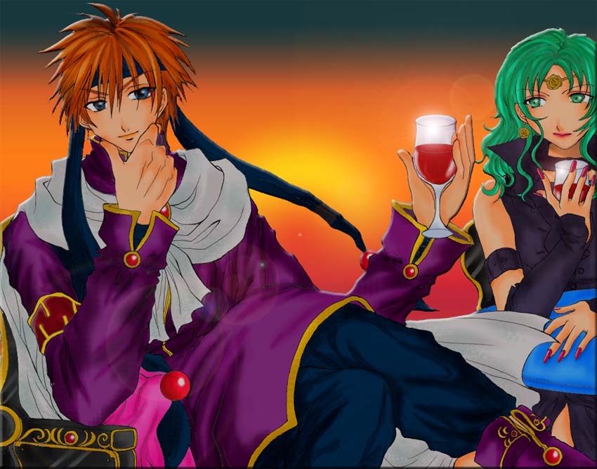 | neptunuse様に塗っていただきましたゼプトです。ほぼデフォルトと同じ色合いの、金髪碧眼ゼプト☆しかし、塗る方によって、同じ色合いでも、こんなに雰囲気が変わるものなんですね〜。髪の塗りが凄く細かく描かれていて、素敵ですvマントの柄も素敵v何気に背景にうちのサイトロゴ入れてくださってるのも嬉しいです!素敵な塗り絵、ありがとうございました! | いつか様に塗っていただきましたゼプト&ルメアです。これもまたデフォルトとほぼ同じ色合いの二人ですが、いつかさん独特の塗り方でまた雰囲気が違って良いですね〜。夕日をバックに、ワインを飲み交わす二人…一体どんな会話をしているのか…。。逆光な感じがとても綺麗です!素敵な塗り絵、ありがとうございました! |