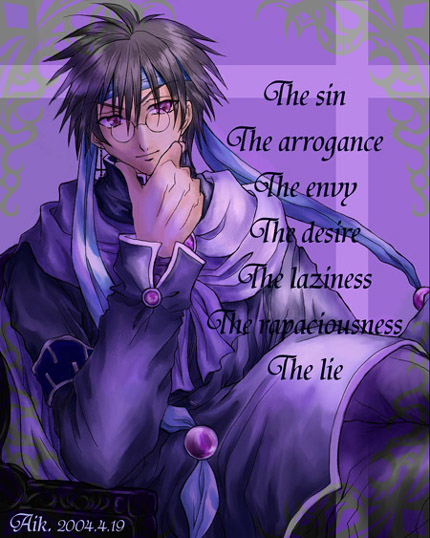 | みな様に塗っていただきましたゼプトです。服装のあらゆるところに、テクスチャやフィルタを使われていて、工夫して塗られているのがとてもよく分かりますね。背景は、写真を使われたのでしょうか?合成もとても綺麗にできていて素敵だと思います!素敵な塗り絵、ありがとうございました! | こぶた様に塗っていただきましたゼプトです。紫色で、統一されていて、とても綺麗ですね。アナログで塗ったような感じのタッチも美しいです!テーマは、「背徳」だそうで、文字は「7つの大罪」が書かれています。彼にはぴったりなイメージですね。期限は過ぎていましたが、メールにて素敵な塗り絵を戴いたので、有り難く飾らせて頂きましたv素敵な塗り絵、ありがとうございました! |