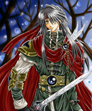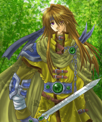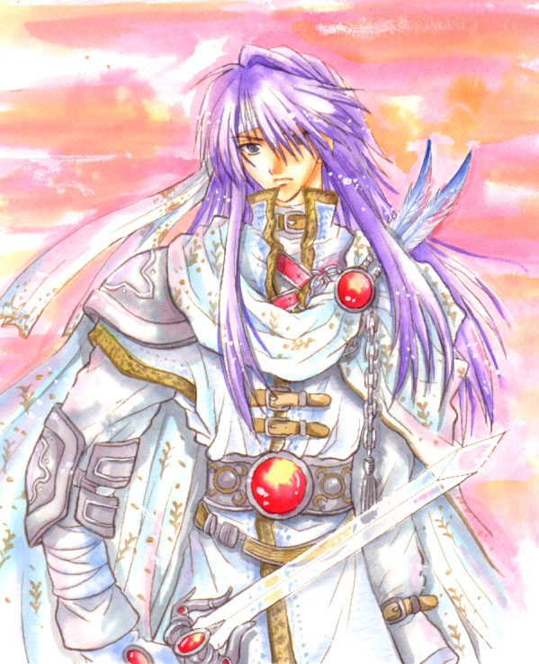 白銀の騎士!白いマントに銀髪!金色の甲冑(微妙に違)!まさにファンタジーですvv背景の感じも爽やかで素敵v彩度低めの色合いの中で羽根や装飾に鮮やかな緑が使われているのがアクセントになっていて綺麗ですv |